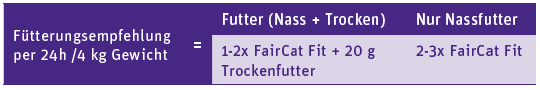 Bitte beachten Sie, dass die angegebenen Mengen nur Richtwerte sind und dem Futterzustand Ihres Tieres sowie dessen Aktivität anzupassen sind. Bieten Sie Ihrem Tier immer frisches Trinkwasser an. Nach dem Öffnen gekühlt bei 2 bis 6 °C lagern und innerhalb von 24 Stunden zimmerwarm verfüttern.