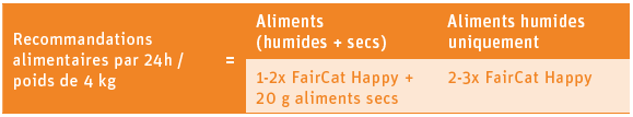 Les quantités sont données à titre indicatif et doivent être adaptées à l’état nutritionnel et à l’activité de votre animal. Veillez à ce que votre animal ait de l‘eau fraîche à disposition. Après ouverture, conserver au réfrigérateur entre 2 et 6 °C et servir à température ambiante dans les 24 heures.