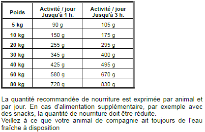 Apport calorifique modéréCette recette apporte une teneur énergétique moyenne par rapport au reste de notre gamme et convient particulièrement bien aux chiens normalement actifs.