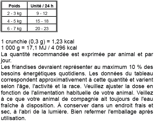 En effet, les crunchies contiennent de précieuses vitamines, de la taurine et ont un effet anti-boules de poils. Nous n'ajoutons pas de sucre, de soja, de lait, de colorants ni de conservateurs. Naturellement.