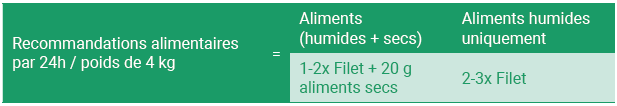 Les quantités sont données à titre indicatif et doivent être adaptées à l’état nutritionnel et à l’activité de votre animal. Veillez à ce que votre animal ait de l‘eau fraîche à disposition. Après ouverture, conserver au réfrigérateur entre 2 et 6 °C et servir à température ambiante dans les 24 heures.