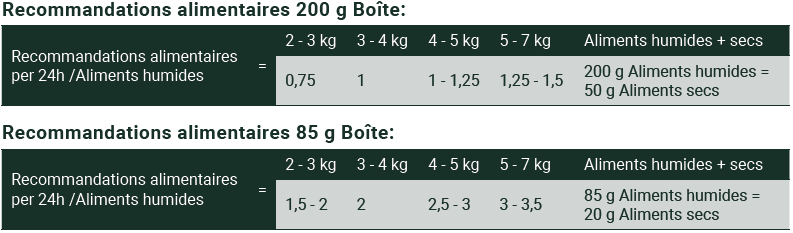 Les quantités sont données à titre indicatif et doivent être adaptées à l’état nutritionnel et à l’activité de votre animal. Veillez à ce que votre animal ait de l‘eau fraîche à disposition. Après ouverture, conserver au réfrigérateur entre 2 et 6 °C et servir à température ambiante dans les 24 heures.