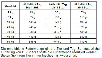 Analytische Bestandteile: Protein 30 %, Fettgehalt 15 %, Rohfaser 4 %, Rohasche 7,4 %, Calcium 1,35 %, Phosphor 0,9 %, Natrium 0,45 %, Magnesium 0,15 %, Kalium 0,8 %.
