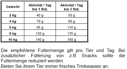 Analytische Bestandteile: Protein: 25 %, Fett: 17 %, Rohfaser: 2,5 %, Rohasche: 8,5 %, Calcium: 1,8 %, Phosphor: 1,1 %, Natrium: 0,45 %, Magnesium: 0,1 %, Taurin: 1000 mg.