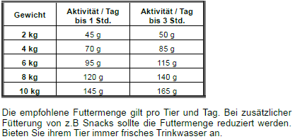 Analytische Bestandteile: Protein: 25 %, Fett: 14 %, Rohfaser: 3 %, Rohasche: 6,4 %, Calcium: 0,9 %, Phosphor: 0,8 %, Natrium: 0,4 %, Magnesium: 0,09 %, Taurin: 1000 mg.