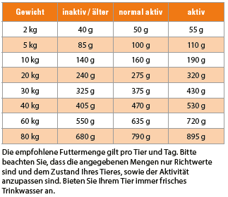 Analytische Bestandteile: Protein 25 %, Fettgehalt 14 %, Rohfaser 2,8 %, Rohasche 7 %, Calcium 1,5 %, Phosphor 1 %, Natrium 0,28 %, Magnesium 0,11 %.